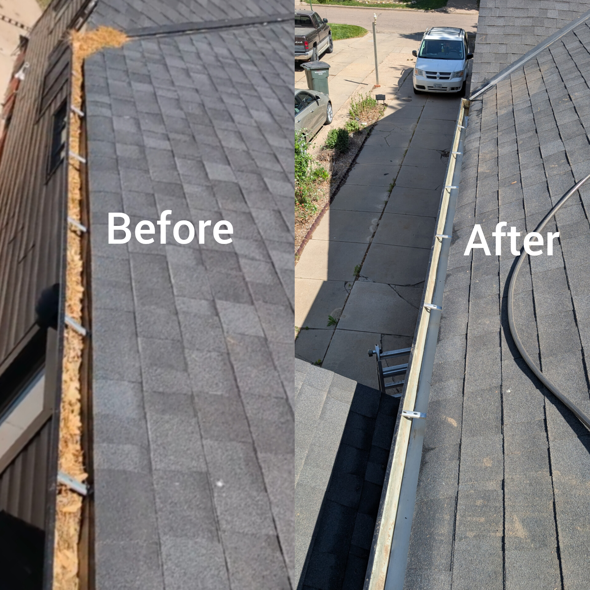 Are your gutters filled with debris? Don’t want to risk getting on a ladder or on the roof? Don’t have the time to do them yourself? Here at King Squeegee we offer gutter cleaning services. Cleaning them out so you don’t have to. So if your looking for someone to clean them out for ya, give us a call and we’ll give you a price for free.Take a look at some of the work I’ve done!